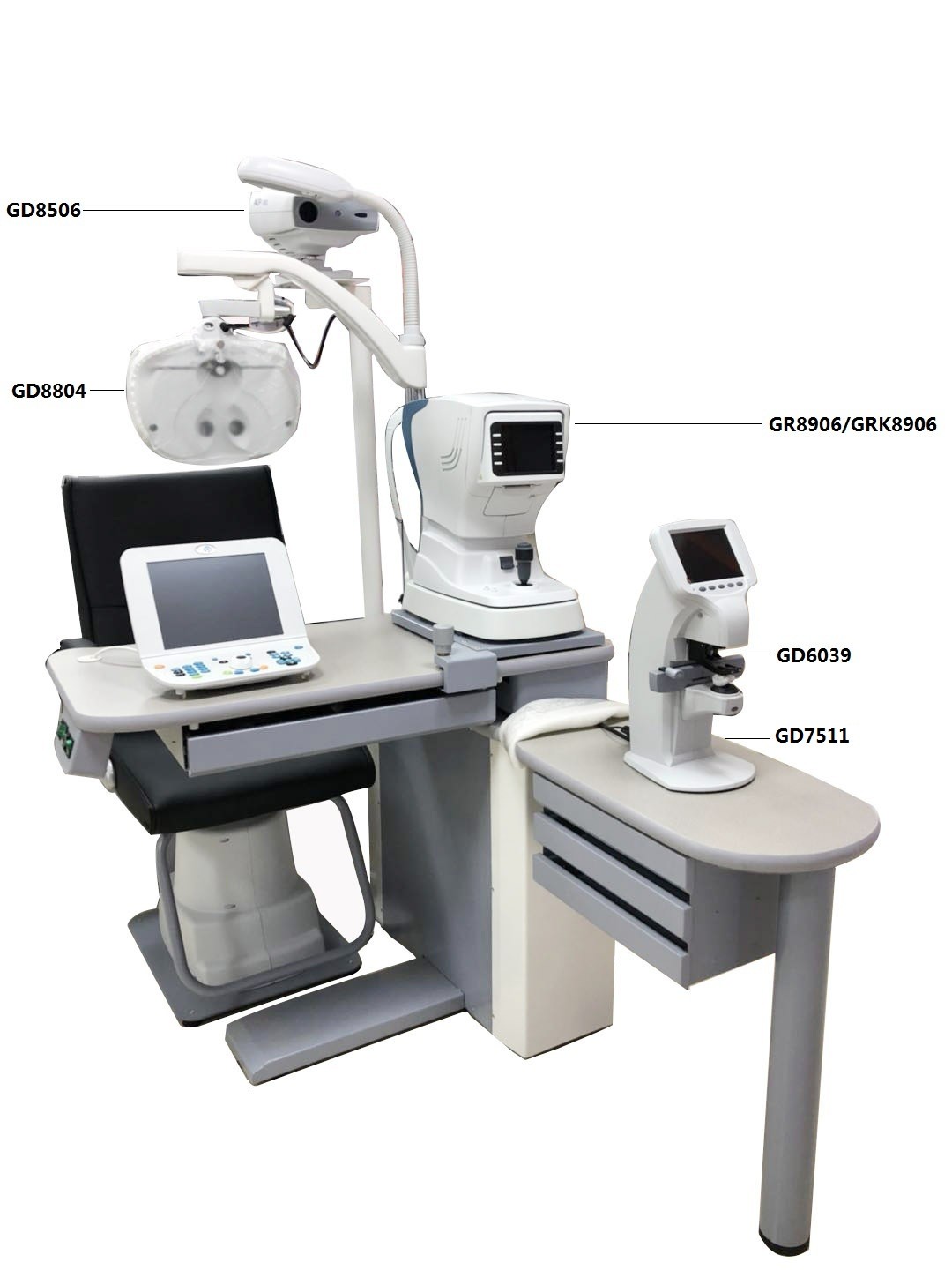 1. Oftalmik Ünite -GD7511: foropter kolu yukarı-aşağı hareket edebilir, döndürülerek ayarlanabilir; Lensmetre yerleşimi için ek bir masa;