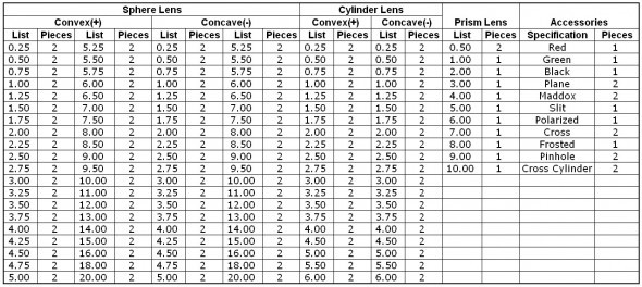 1. Bu deneme lens seti, 266 adet deneme lensi içerir, tüm güçler 2 adettir (1 çift),